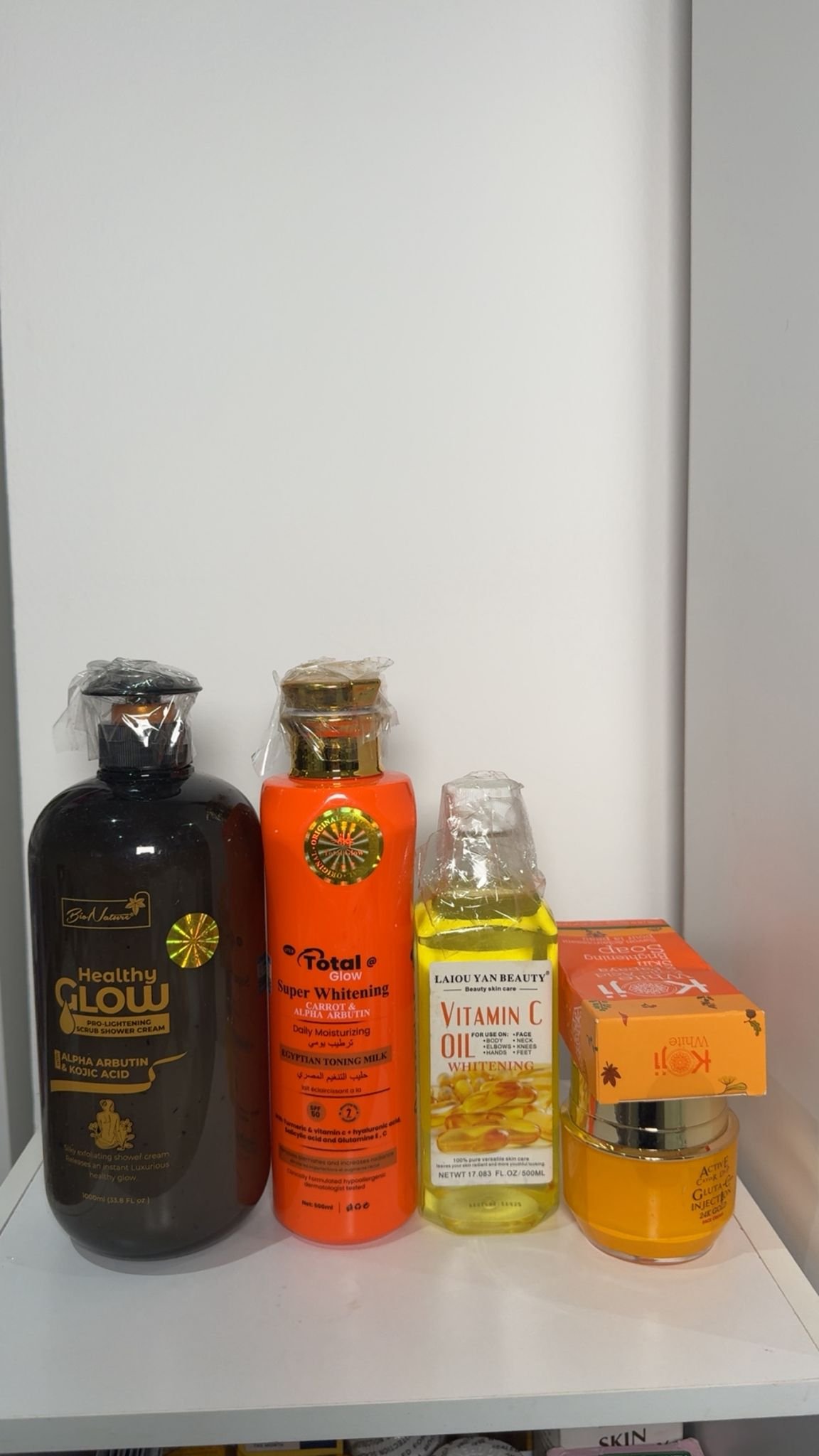 Healthy glow body wash Total glow lotion Vitamin c oil Kojie white lotion Active carvier face cream